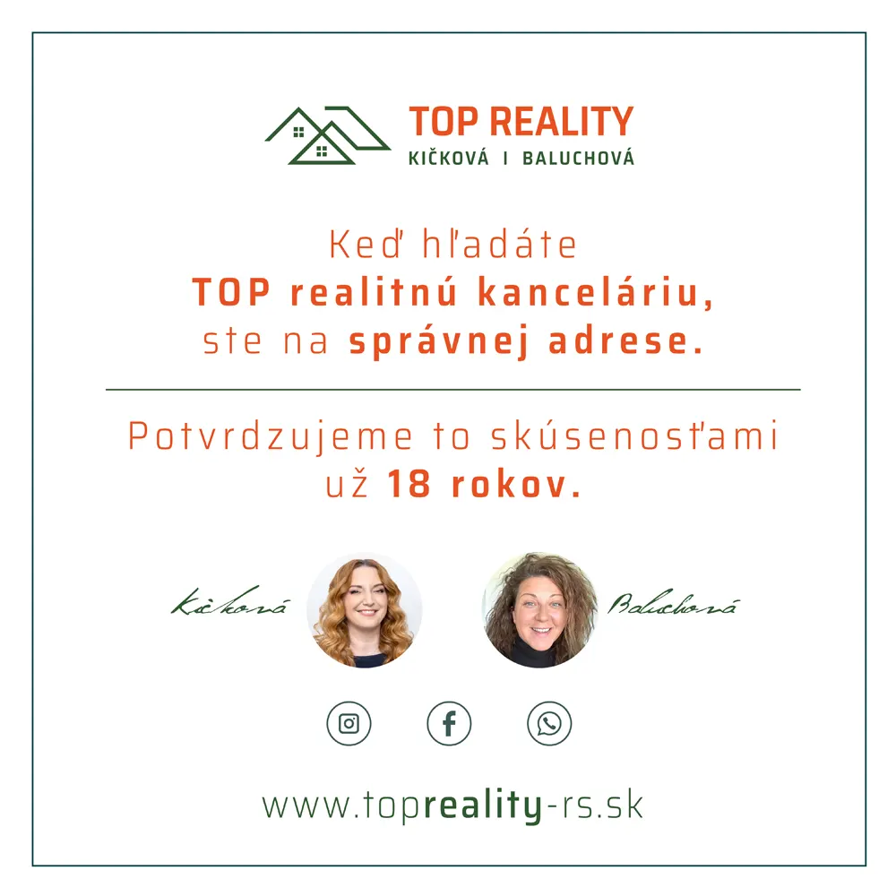 Vitajte na stránke TOP REALITY – realitná spoločnosť, s.r.o. Naša realitná kancelária je na trhu od roku 2008. Našim cieľom je poskytovať kvalitné a dostupné realitné služby pre širokú verejnosť, bezpečne previesť kupujúcich a predávajúcich zložitým procesom kúpy, predaja a prenájmu nehnuteľnosti. S dôverou sa na nás obráťte - uisťujeme Vás, že spravíme všetko pre to, aby ste boli s našimi službami maximálne spokojný. Našim klientom pomáhame už 18 rokov a radi pomôžeme aj Vám.